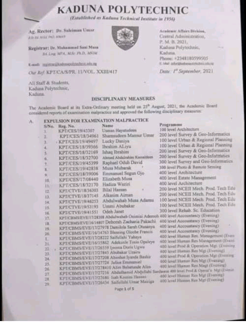 The Management of Kaduna State Polytechnic has expelled 85 students over malpractice and other academic misconducts.