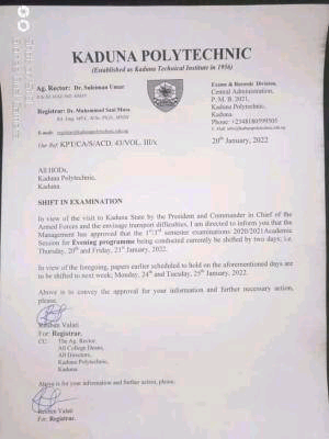 In view of the visit to Kaduna State by the President and Commander in Chief of the Armed Forces and the envisaged transport difficulties, this is to inform you that the Management has approved that the 1/3″ semester examinations 2020/2021 Academic Session for Evening programme being conducted currently be shifted by two days: i.e Thursday, 20 and Friday, 21 January 2022.